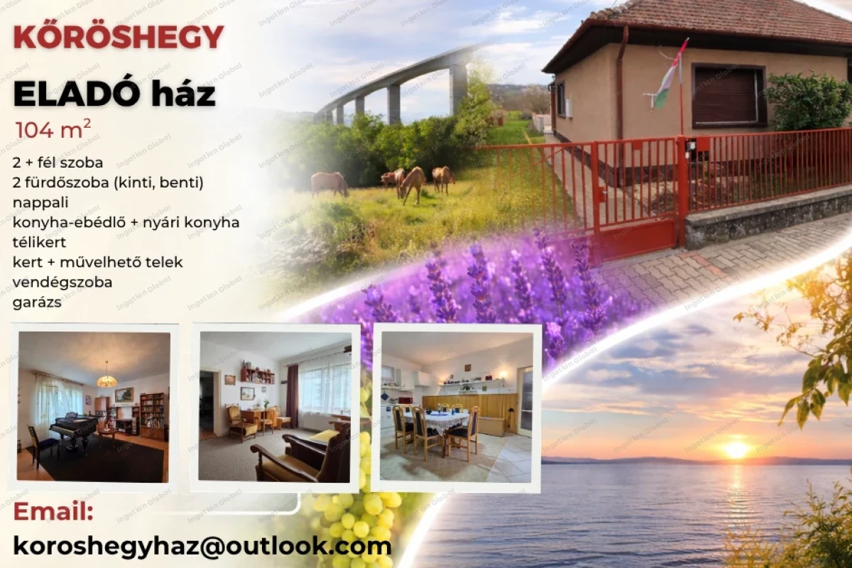 ELADÓ CSALÁDI HÁZ - Kőröshegy A Balaton déli részén, csendes, rendezett környezetben kínálunk eladásra egy sokoldalúan hasznosítható házat, amely kiváló választás lehet nagycsaládosoknak, több generáció együttélésére, nyaralónak, vagy akár befektetési célra. Miért jó választás? > Nagyméretű telek - gazdálkodásra, kertészkedésre is alkalmas > Kiváló befektetés > Balaton közelsége > Nyugodt, élhető környezet Főbb adatok: Telek mérete: 2052 m² Lakótér: 104 m² Építés éve: kb. 1960–70 Falazat: tégla Tájolás: DK (délkeleti, világos terek) - 3 szoba (2+fél hivatalosan) + nappali + külön bejáratú vendégszoba (régi garázs lett kialakítva) - nyári konyha + spejz - nyári fürdő - „kilátó” terasz - garázs - télikert - mosókonyha - műhely Műszaki jellemzők: Fűtés: cserépkályha + kazán Melegvíz: - házban: kazán - nyári fürdő: villanybojler Konyhák: - házban: villanytűzhely, elektromos sütő - nyári konyha: gáztűzhely Felújítások (kb. 13 éve): - villanyvezetékek cseréje - víz- és gázvezetékek korszerűsítése - kazán beüzemelése - felső konyha kialakítása Távolságok: - Balaton: ~ 4 km - Balatonföldvár központ: ~5 km - Kőröshegyi levendulás: ~3 km - Siófok: ~12 km Közlekedés: - Helyi és helyközi buszjáratok elérhetők (buszmegálló 5 p séta) - Vasút: Balatonföldváron - Autóval gyors kapcsolat az M7-es autópályához Intézmények, üzletek: Séta távolságra: 5 p: Óvoda 5-15 p: Gazdabolt, ABC, Takarmánybolt, Dohánybolt, Coop Autóval: 6 p: Bölcsőde, Balatonföldvár Általános Iskola, Zeneiskola 10 p: Waldorf iskola, Bálványos 6 p: Aldi, Spar, Pepco, KIK, DM, piac Tökéletes választás, ha nyugalmat, teret és lehetőséget keresel! Ingatlanos kollégák segítségét nem kérjünk, köszönjük. Telefon: +36305178952 Email: koroshegyhaz@outlook.com